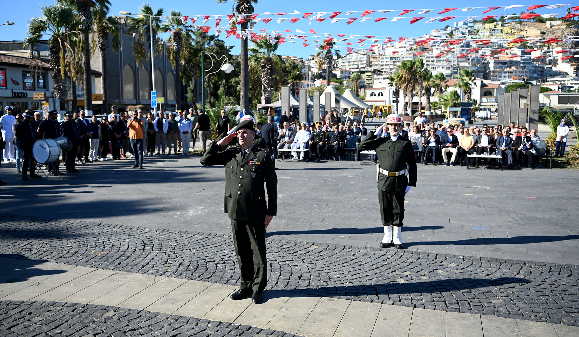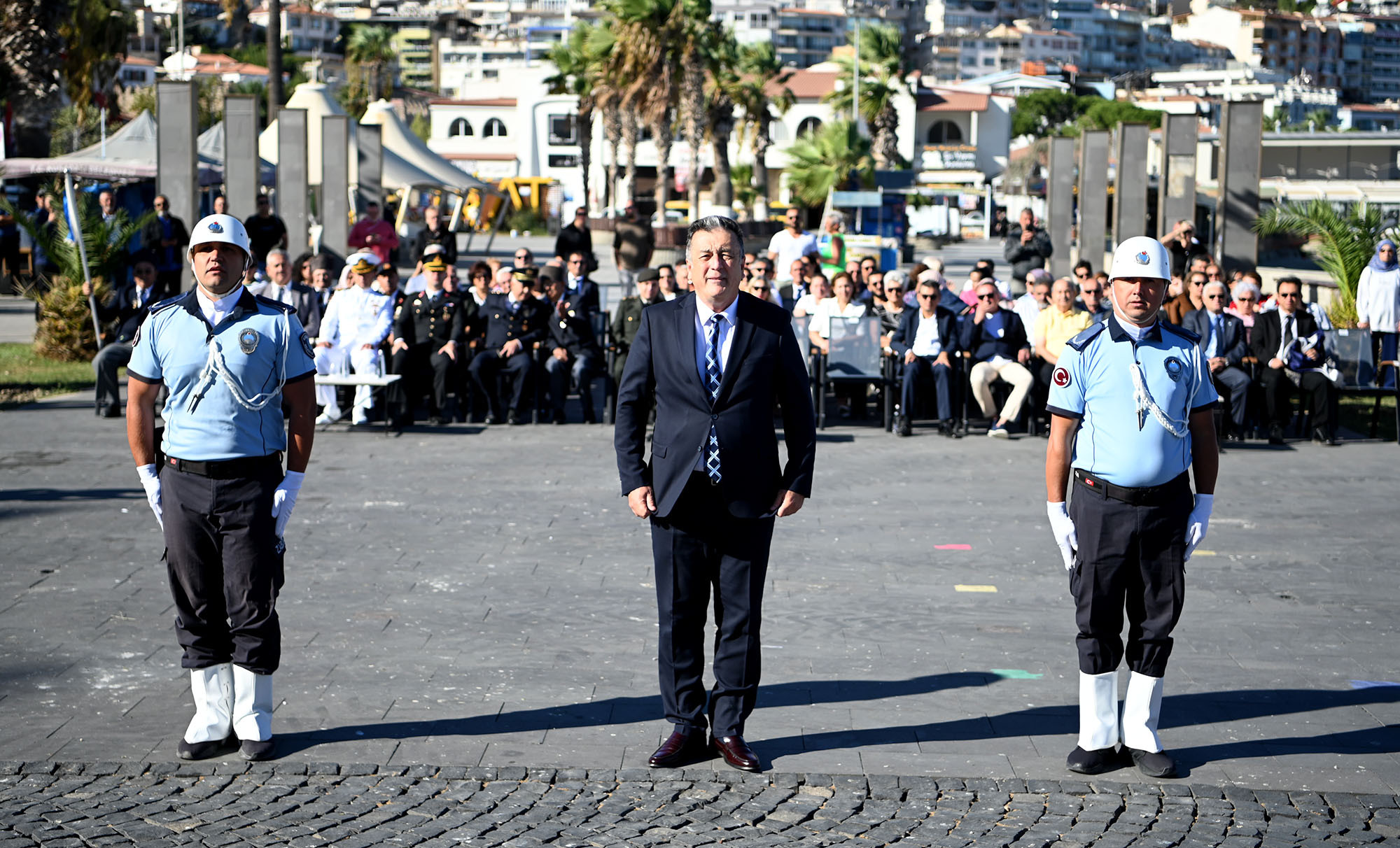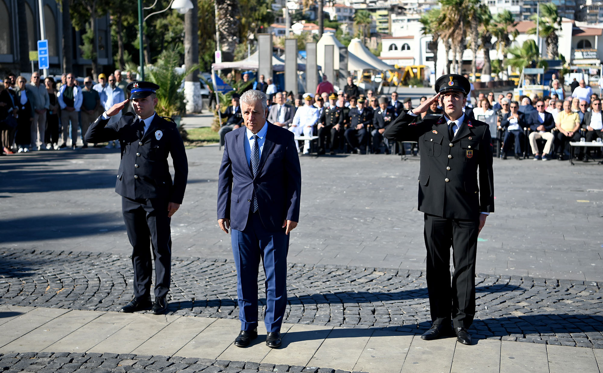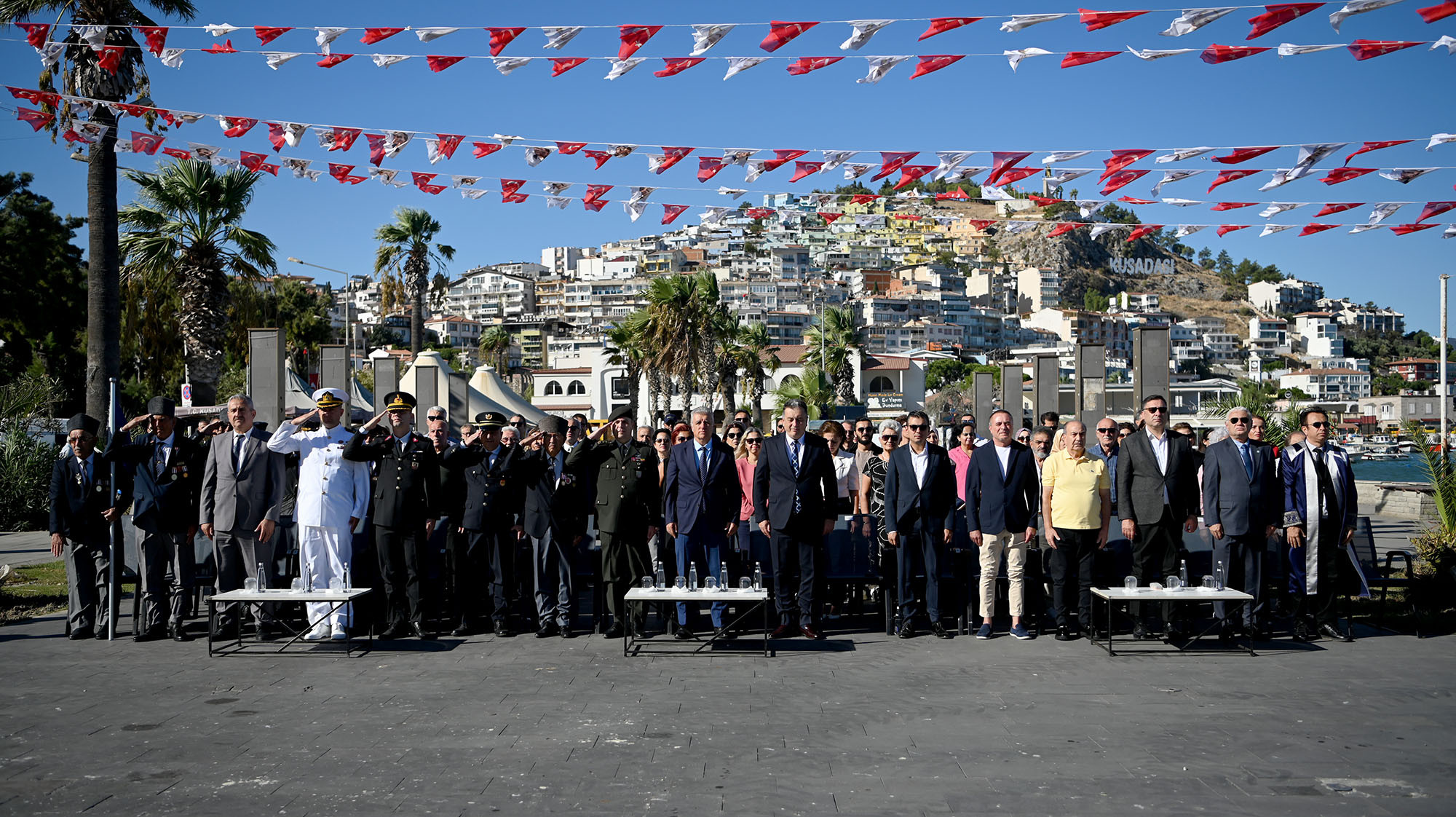 Atatürk Meydanı’nda saat 09.30’da başlayan törene; Kuşadası Kaymakamı İbrahim Keklik, Kuşadası Belediye Başkan Vekili Ethem Kerim, Garnizon Komutanı Personel Albay İlker Görkem, Türkiye Muharip Gaziler Derneği Kuşadası Şubesi ve Kuşadası Şehit Aileleri ve Gaziler Derneği Başkanı Uğur Atilla, belediye meclis üyeleri, siyasi parti ilçe yöneticileri ile şehit ve gazi yakınları katıldı.