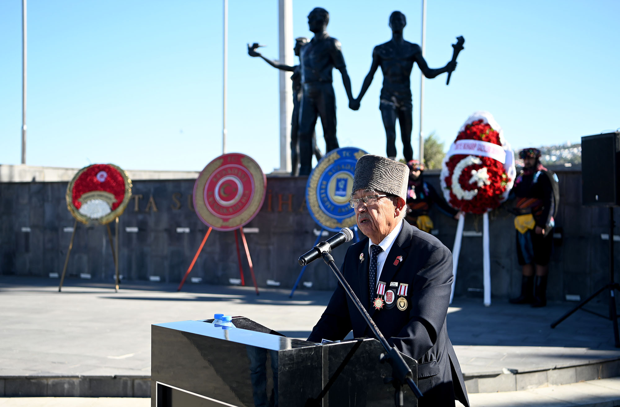 Günün anlam ve önemini belirten konuşmayı yapan Türkiye Muharip Gaziler Derneği Kuşadası Şubesi Başkanı Uğur Atilla, “Bu vatanın bir karış toprağı için canını adayan kahramanları unutmamak ve her zaman yanlarında olmak hepimizin vefa borcudur. Şanlı Türk tarihinin zaferlerinin mimarı şehit ve gazilerimiz hiçbir zaman unutulmamalıdır. Bu toprakları vatan yapan atalarımızın emanetine sahip çıkmak için ‘ölürsek şehit, kalırsak gazi oluruz’ düşüncesiyle her türlü düşmana karşı kahramanca mücadele veren Türk Askeri ve taşıdığı yüce ruh var olduğu sürece bölünmez bütünlüğümüze ve milli birliğimize kast edenlerin kirli emelleri asla gerçekleşmeyecektir. Türkiye Cumhuriyeti Kurucusu Gazi Mustafa Kemal Atatürk ve tüm silah arkadaşları başta olmak üzere bu vatan için canını, kanını, hayatını gözünü kırpmadan veren tüm şehitlerimize, ebediyete intikal etmiş ve hayatta olan tüm gazilerimize şükranlarımızı sunuyoruz” dedi.