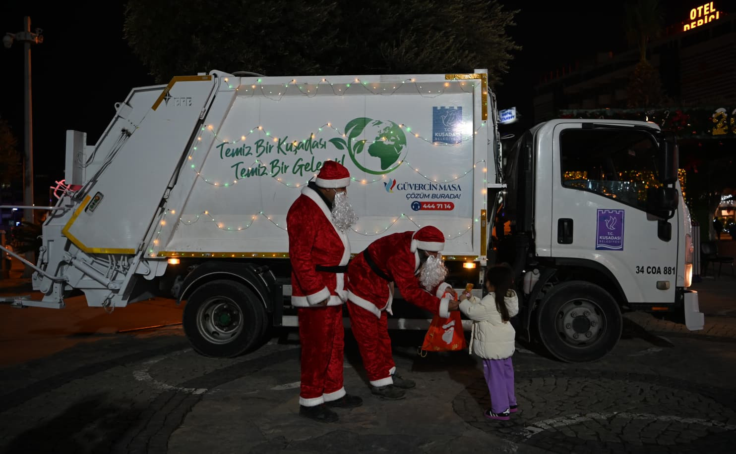 Işıklarla süslenen kamyonlardan inen Noel Baba kostümlü belediye personeli, çocuklara ve yetişkinlere şeker ikram etti. Etkinlik kapsamında çevrenin temiz tutulması için yapılması gerekenler anlatılırken, doğanın korunmasının önemi vurgulandı. Hem kent sakinlerinin hem de Kuşadası’nı ziyaret eden yerli ve yabancı turistlerin yoğun ilgisiyle karşılanan etkinlik, yeni yıl atmosferine çevreci bir anlam kattı.