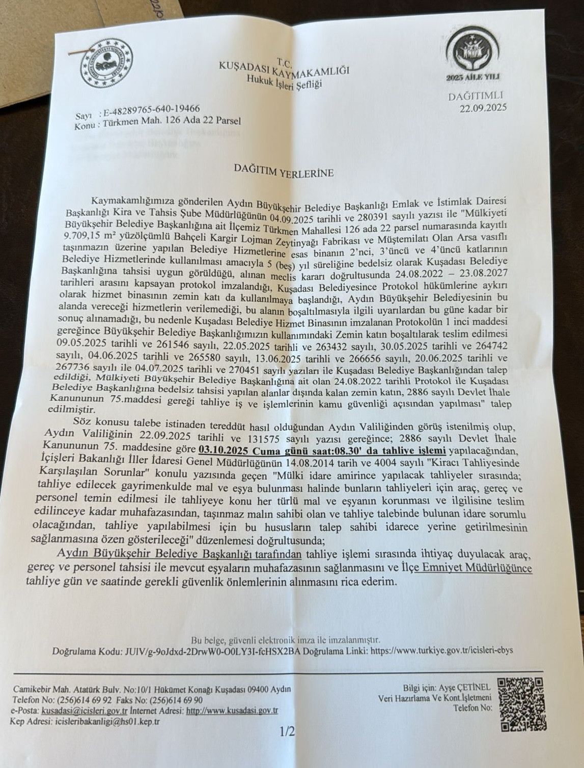 “Yalan” denilen tahliye kararı, Aydın Büyükşehir Belediyesi Emlak ve İstimlak Daire Başkanlığı Kira ve Tahsis Şube Müdürlüğü’nün 24.09.2025 tarihli yazısıyla Kuşadası Kaymakamlığı’ndan tahliye talebinde bulunduğunu gösteren resmi evraklarla ortadadır.