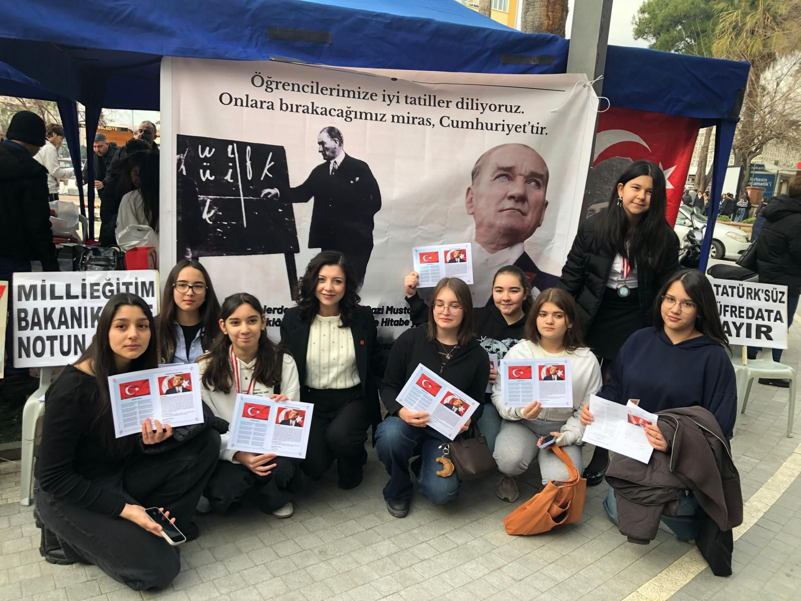 Bugün burada öğrencilerimize İstiklal Marşı'nı ve Gençliğe Hitabe'yi dağıtıyoruz. Çünkü biz biliyoruz ki ne yaparlarsa yapsınlar Atatürk'ü kalbimizden de aklımızdan da fikrimizden de silemeyecekler.